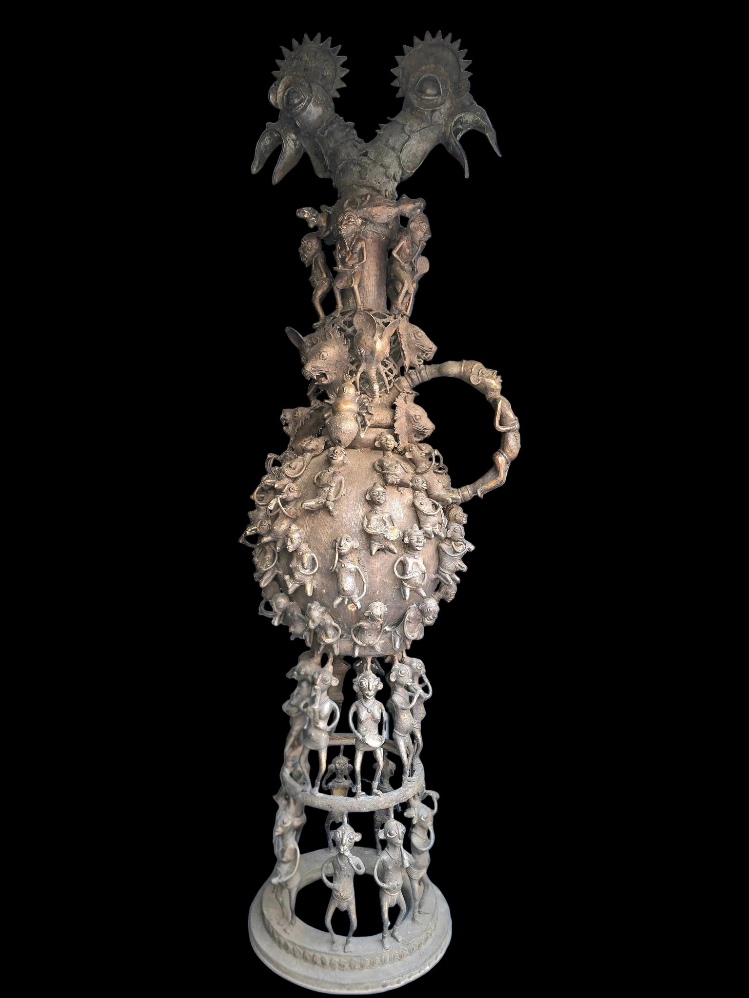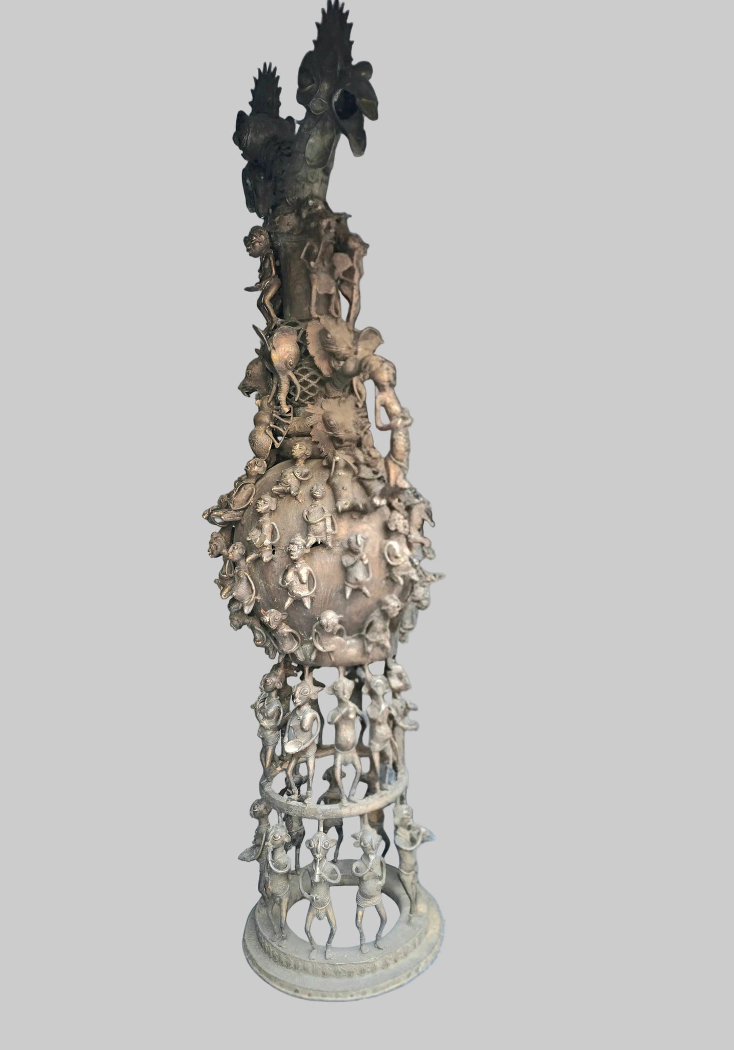 Le corps central, sphérique et orné de personnages en relief, est soutenu par une base circulaire composée de figures debout formant une ronde, suggérant la communauté, la protection et l’ordre social. La patine naturelle du bronze, aux nuances brunes et dorées, témoigne du temps et confère à la pièce une présence authentique et puissante.