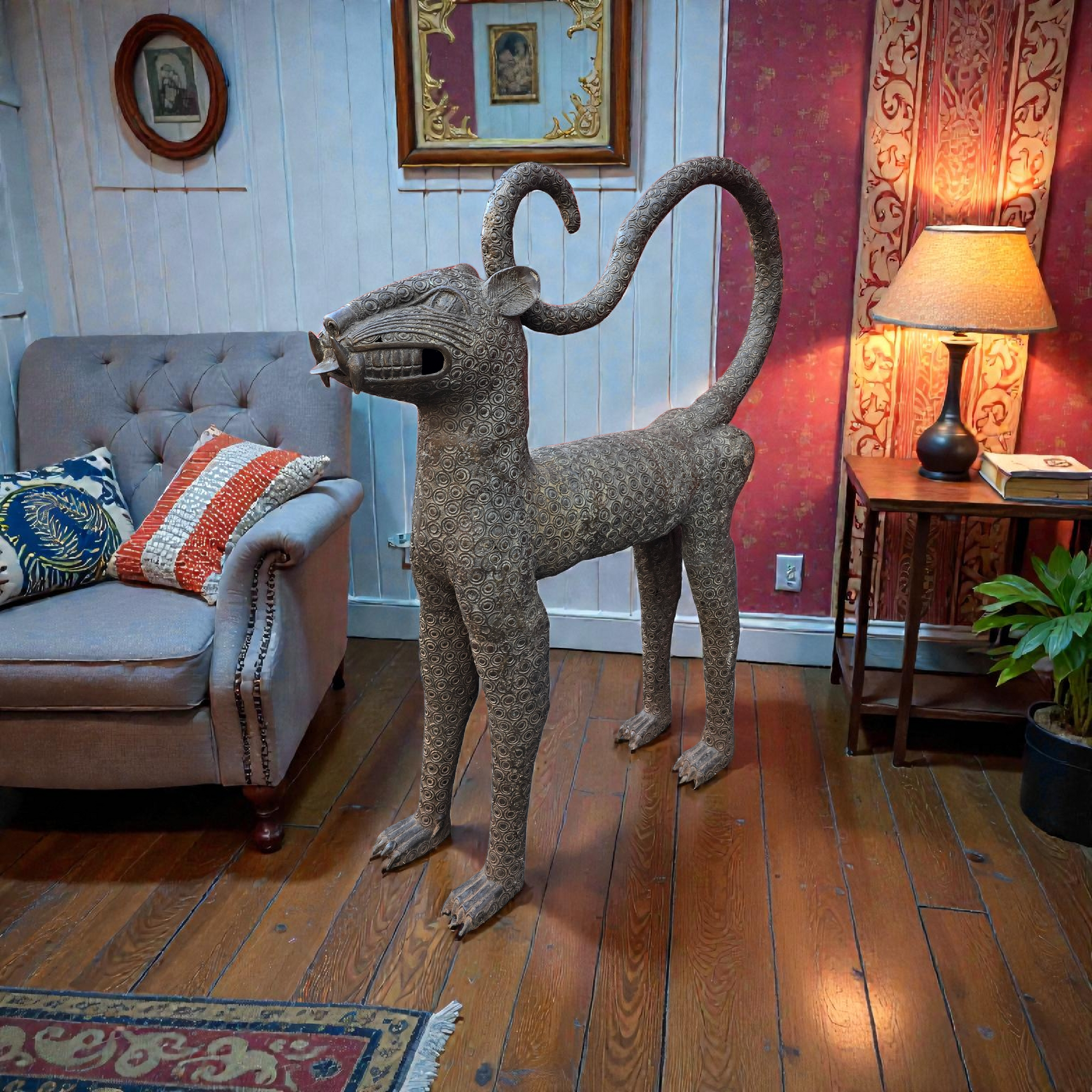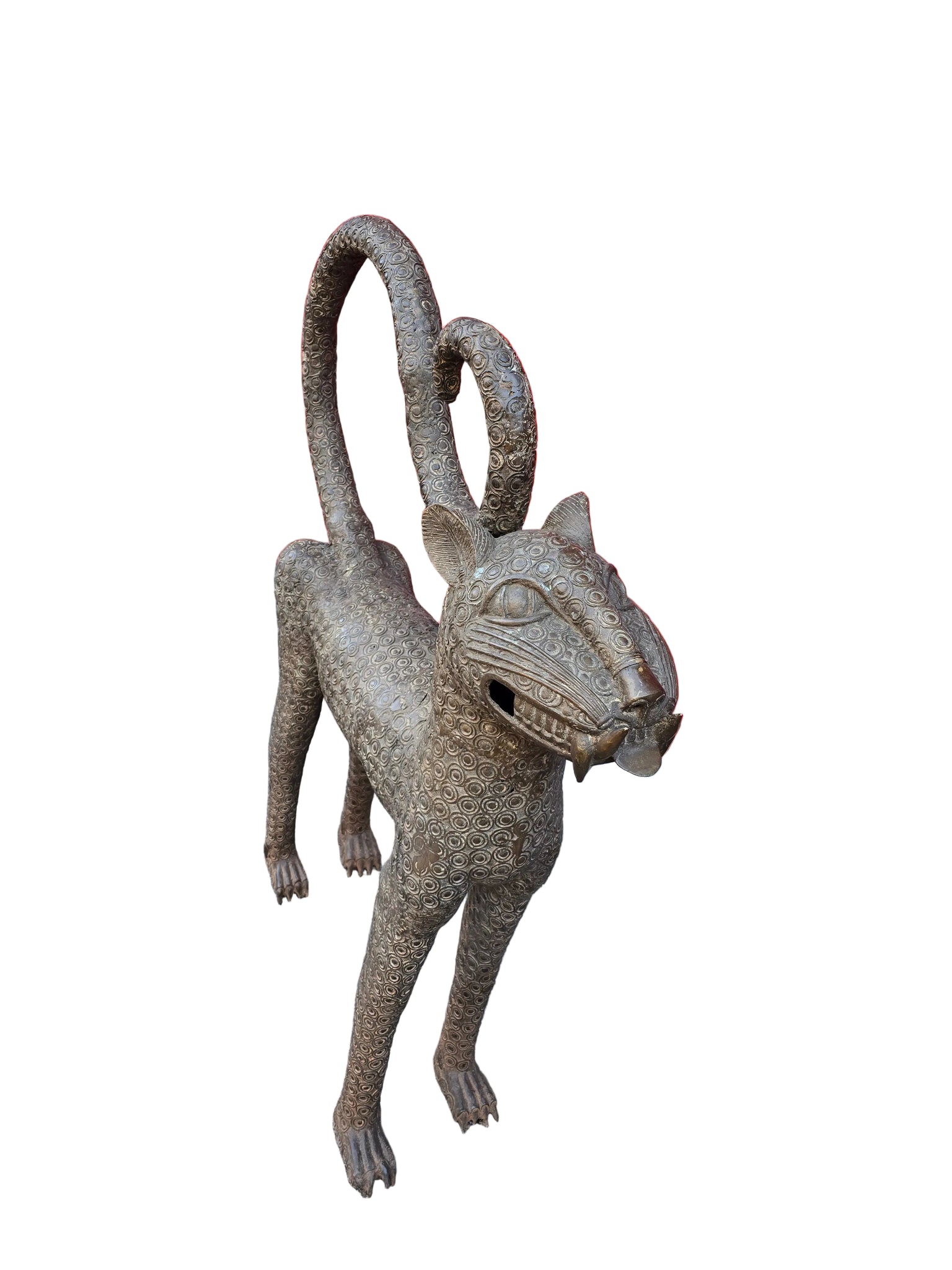 In Benin tradition, the leopard is regarded as the symbolic counterpart of the king, a guardian of power and an embodiment of earthly dominance. Such sculptures were traditionally associated with royal palaces, court rituals, and commemorative functions.