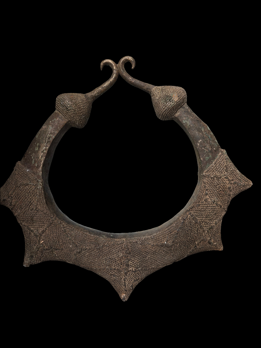 De forme circulaire ouverte, aux extrémités renforcées et richement texturées, ce bracelet présente une patine ancienne et des traces d’oxydation naturelle attestant de son âge et de son usage.