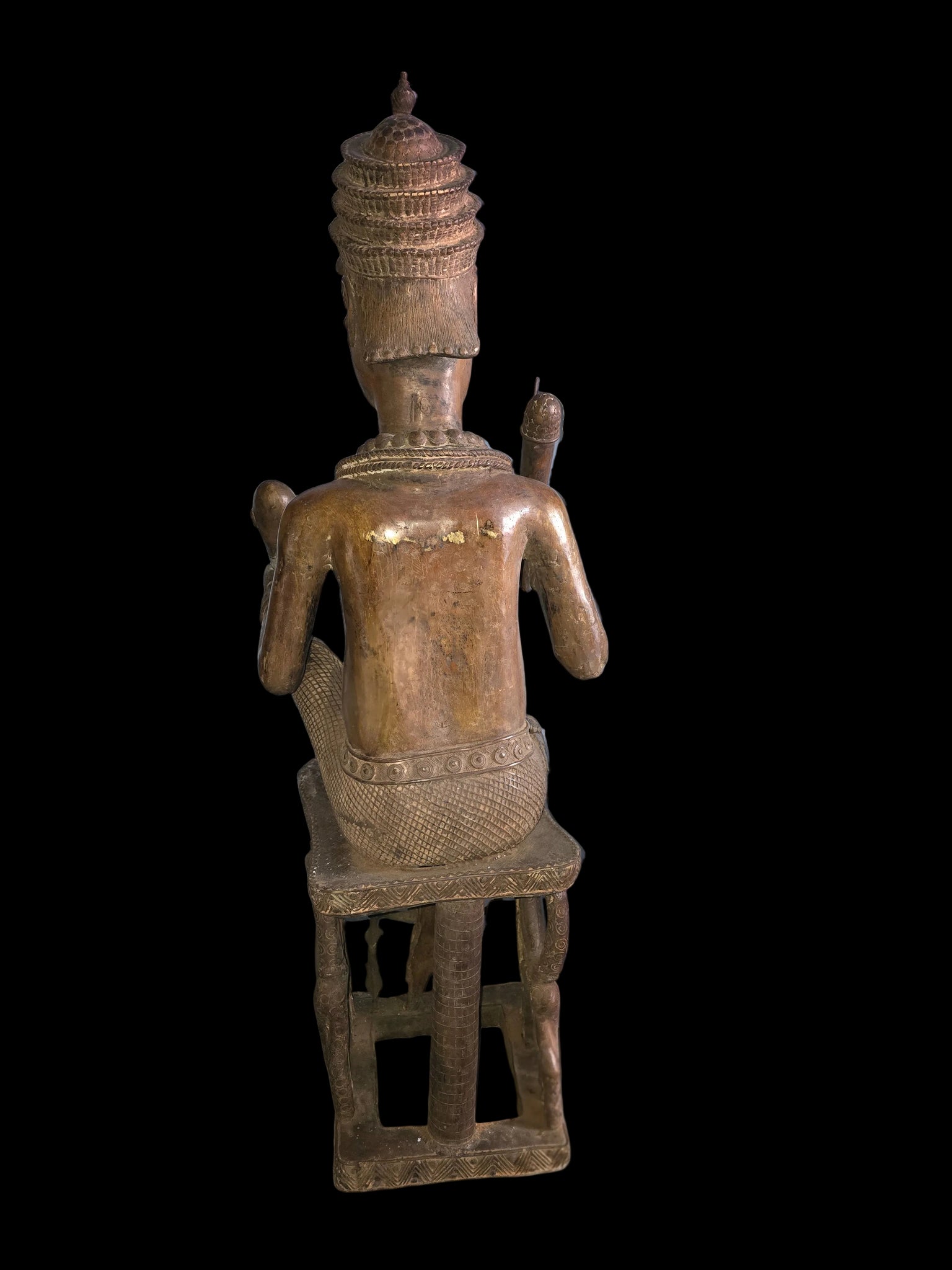 The piece was created using the traditional lost-wax casting technique, an ancient and highly skilled process that ensures each sculpture is unique. The figure depicts a seated dignitary or royal personage, adorned with an elaborate headdress, beaded necklace, and finely detailed attire, all emblematic of high social or political status within Benin court art.