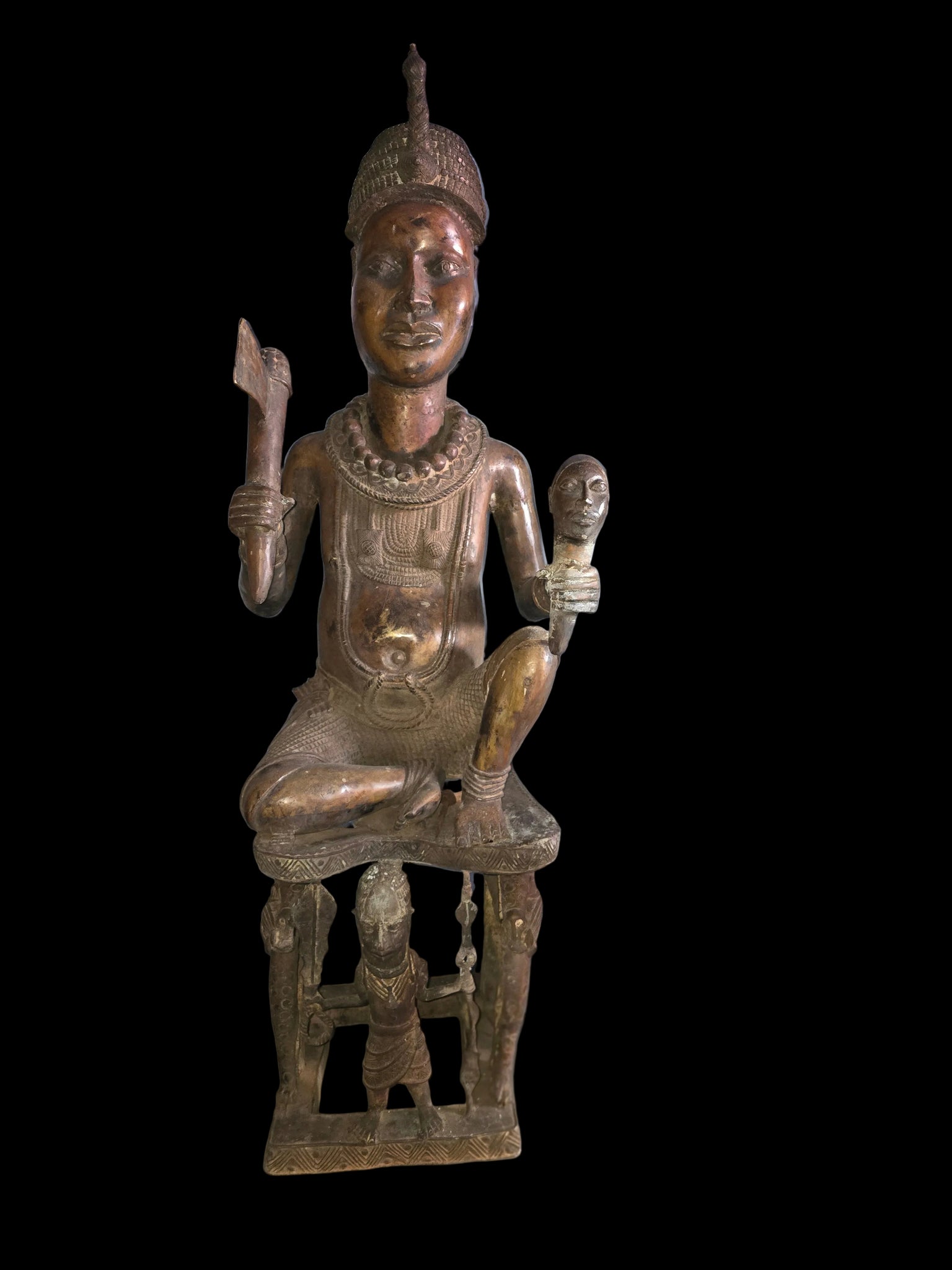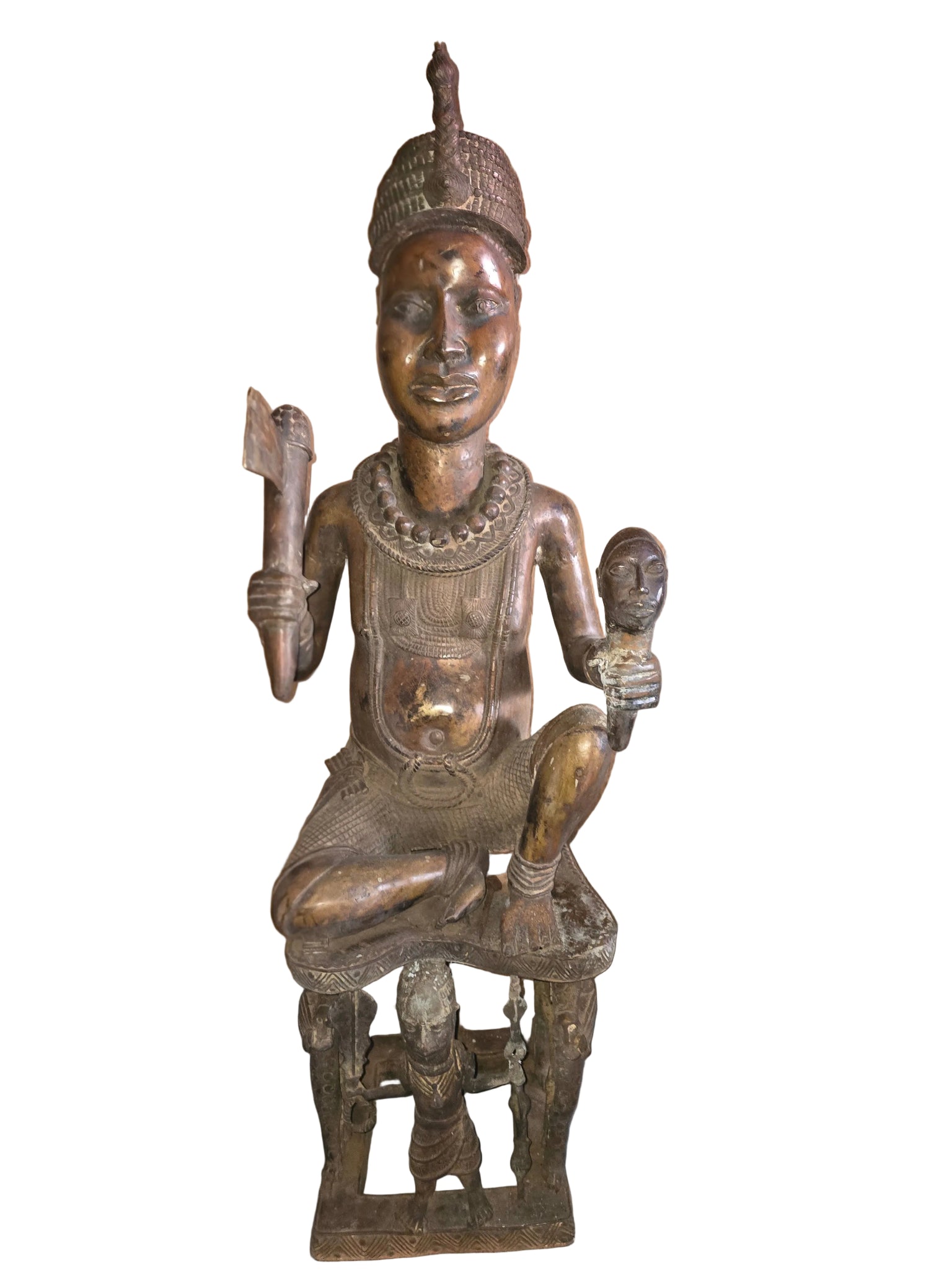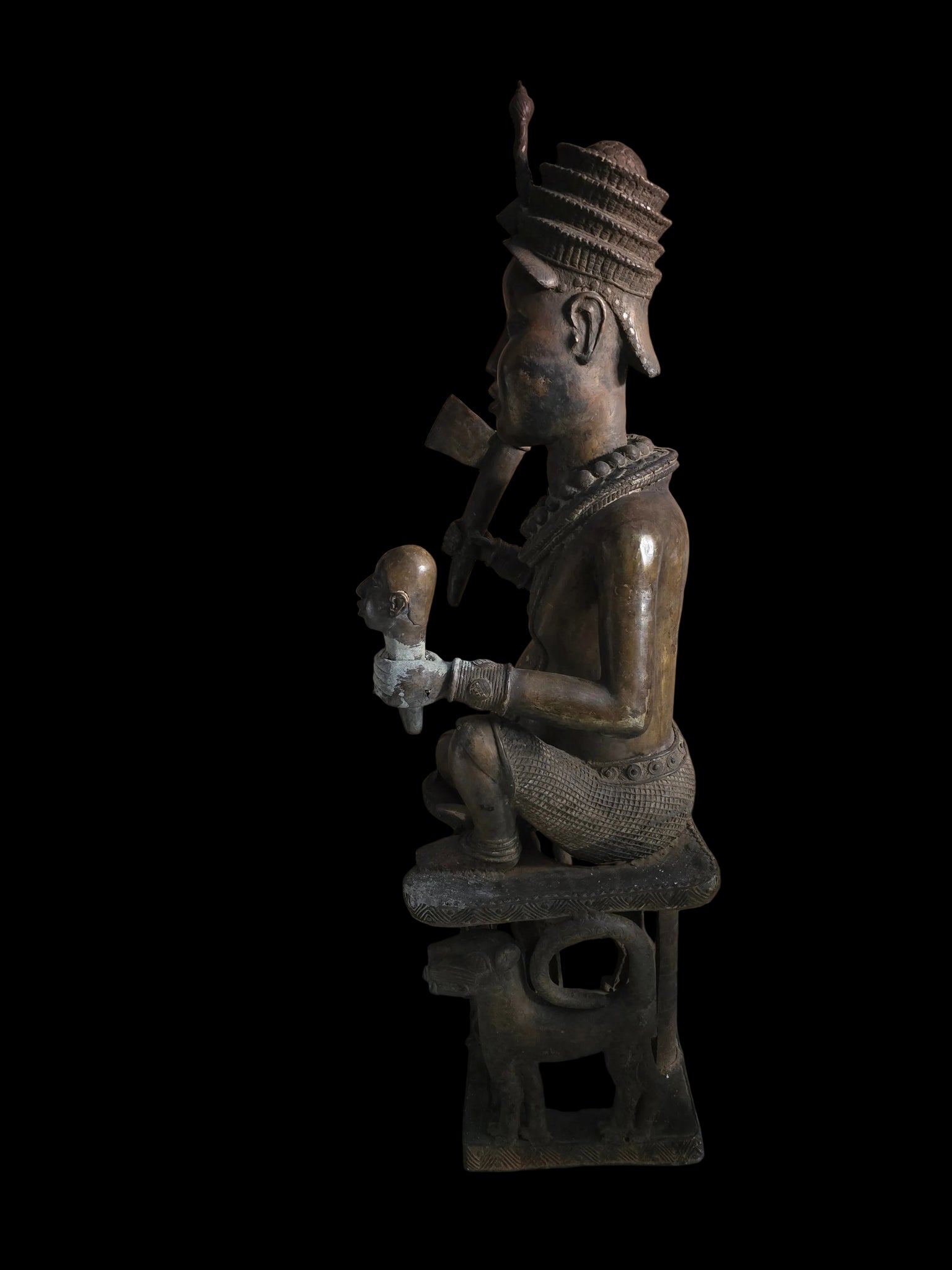 This impressive bronze sculpture originates from ancient Benin City, the former capital of the Kingdom of Benin (present-day Nigeria), internationally renowned for its highly sophisticated bronze casting tradition.
